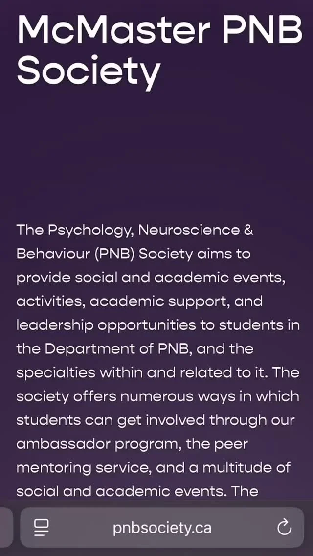 The Psychology, Neuroscience & Behaviour (PNB) Society aims to provide social and academic events, activities, academic support, and leadership opportunities to students in the Department of PNB, and the specialties within and related to it. The society offers numerous ways in which students can get involved through our ambassador program, the peer mentoring service, and a multitude of social and academic events. The societyโs events facilitate both social and academic growth through faculty and peer interactions that allow for long-lasting connections, and academic opportunities. These connections create a tight-knit and inclusive cohort, connecting all specializations under the PNB department, and fostering a close community across all levels of the program where students can thrive.